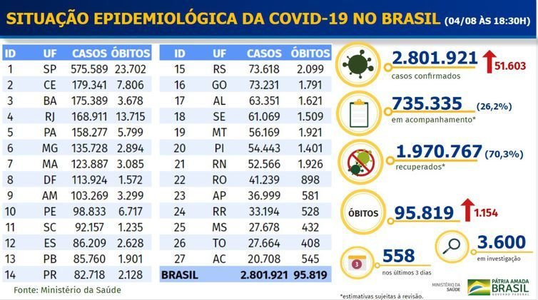 Desde o início da pandemia, 2.801.921 de brasileiros contraíram o vírus. O total de mortes chega a 95.819. Há 3,6 mil óbitos em investigação. Nas últimas 24 horas, foram registrados 51.603 novos casos confirmados de covid-19 e 1.154 mortes relacionadas à pandemia do novo coronavírus. Os números estão no balanço diário de hoje (4) publicado pelo Ministério da Saúde.