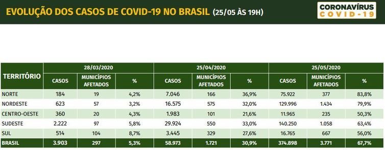 Em entrevista no Palácio do Planalto, o secretário substituto de Vigilância em Saúde do Ministério da Saúde, Eduardo Macário, mostrou que há uma tendência de interiorização da pandemia de covid-19 no Brasil. No dia 27 de março, 5,3% dos municípios tinham casos confirmados. No dia 25 de abril, o índice subiu para 30,9%, e em 25 de maio, para 67,7%. No total, 3.771 cidades registram pessoas infectadas. No recorte por região, o maior percentual de cidades com casos confirmados é o Norte, com 83,8%. Em seguida vêm Nordeste (79,9%), Sudeste (63,4%), Sul (56%) e Centro-Oeste (50,3%).