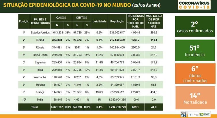 Macário afirmou que os números mostram o Brasil em uma curva ascendente, tanto no número de casos quanto no de mortes. Já outros países com grande número de casos e mortes já estão em uma trajetória ou de estabilização ou descendente. O país é o segundo país em número de casos de covid-19, mas o 51º em incidência da doença, quando a quantidade de pessoas infectadas é analisada proporcionalmente à população. Enquanto o país ocupa a sexta posição em número absoluto de mortes, fica em 14º em mortalidade, quando esses óbitos são comparados com o total da população.