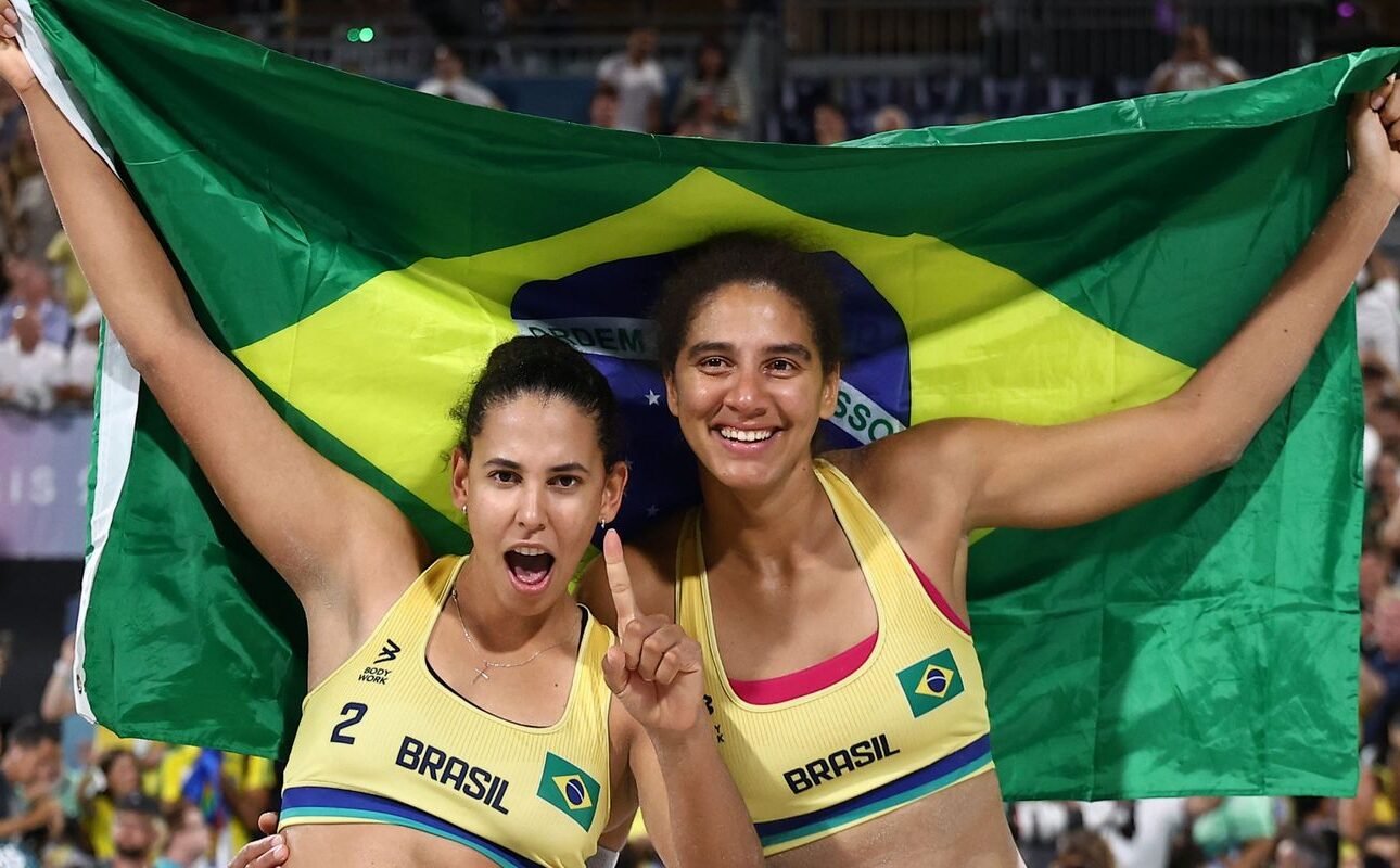 As campeãs olímpicas do vôlei de praia Duda Lisboa e Ana Patrícia serão as porta-bandeiras do Brasil na cerimônia de encerramento dos Jogos de Paris, às 16h (horário de Brasília) de domingo (11), no Stade de France. As jogadoras foram anunciadas pelo Comitê Olímpico do Brasil (COB) na tarde deste sábado (10). Duda, sergipana de São Cristóvão, e a mineira Ana Patrícia, nascida em Espinosa, faturaram a medalha dourada na sexta (9), após 28 anos de jejum de ouros do vôlei de praia feminino brasileiro. A dupla fez uma campanha invicta (sete triunfos seguidos) em Paris, coroada com vitória na final contra as canadenses Melissa e Brandie por 2 sets a 1 (26-24, 12-21, 15-10).