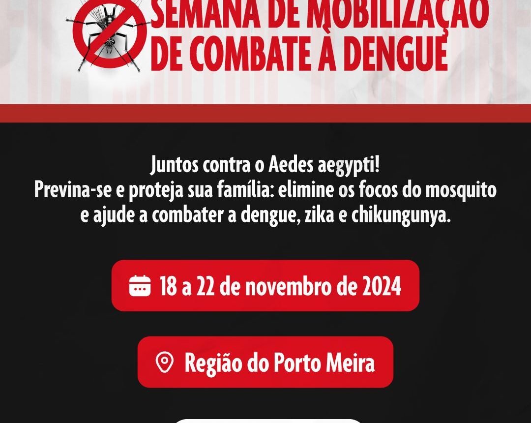 A Semana de Mobilização de Combate à Dengue, organizada pela Secretaria Municipal de Saúde (SMSA), ocorrerá de segunda-feira (18) até sábado (22) na região do Porto Meira. A ação é parte do evento nacional Dia D de Combate à Dengue e tem como objetivo principal a mobilização de toda a população para atuar em conjunto com os órgãos públicos na luta contra o mosquito Aedes aegypti, transmissor da dengue, zika e chikungunya.