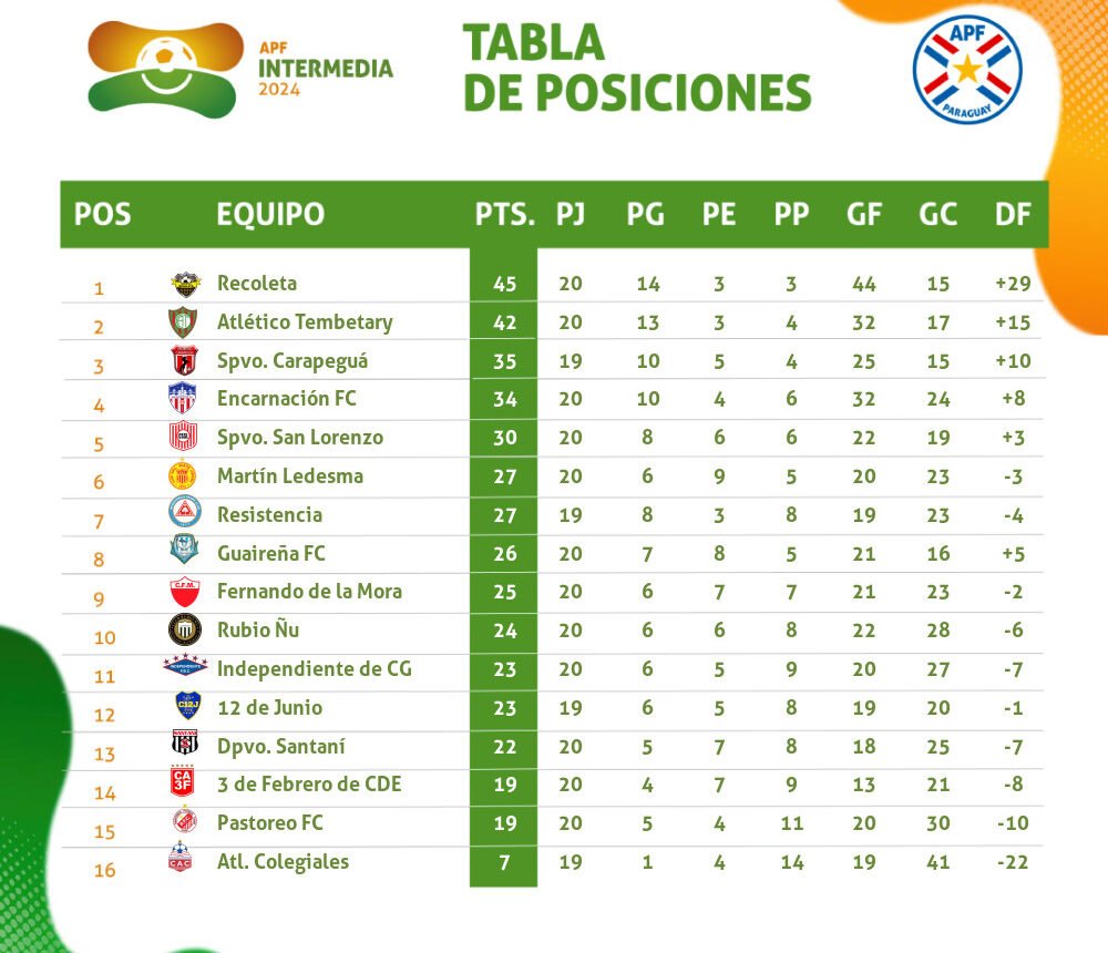 Tembetary continua sendo o único armador com 42 pontos, após vencer o San Lorenzo por 2 a 1, que estagnou nos 30 pontos.