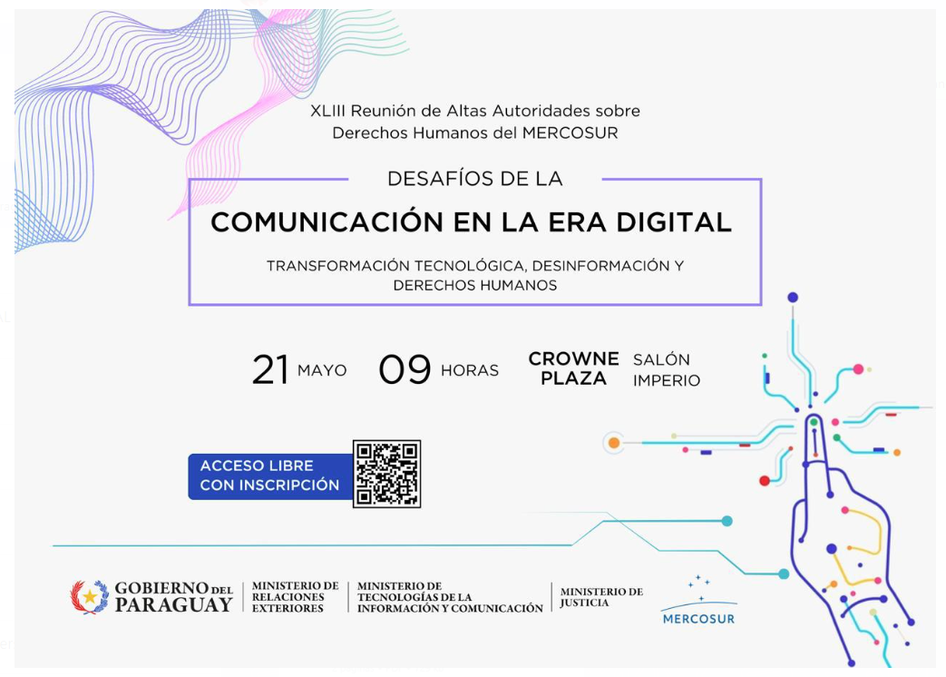 Asunción, Agencia IP.- Este martes 21 se desarrollará el seminario “Comunicación en la Era Digital: Transformación Tecnológica, Desinformación y Derechos Humanos”, en el Hotel Crowne Plaza de Asunción, desde las 9:00. Está dirigido a comunicadores del sector público y privado, así como al público interesado. El acceso es libre previa inscripción en el siguiente enlace.