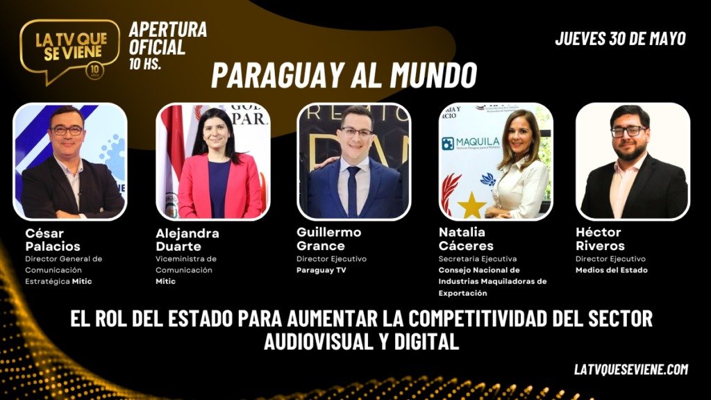 Asunción, Agencia IP.- La décima edición anual de “La TV que se viene” se desarrollará este jueves 30 de mayo, con presencia de comunicadores de los medios del Estado paraguayo, quienes darán apertura al evento con un panel denominado “Paraguay al mundo: el rol del Estado para aumentar la competitividad del sector audiovisual y digital”. El encuentro de medios que reunirá a toda la industria de la televisión será en el Salón de Eventos Casa 1927, Avda. España 505.