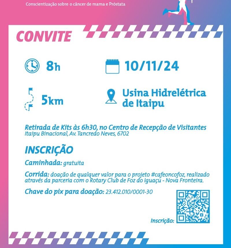 Os(as) atletas de Foz do Iguaçu e região estão convidados para uma prova muito especial: a Corrida pela Vida, promovida pela Itaipu Binacional e o Hospital Ministro Costa Cavalcanti como parte da programação de outubro rosa e novembro azul, para a conscientização quanto à prevenção dos cânceres de mama e próstata.