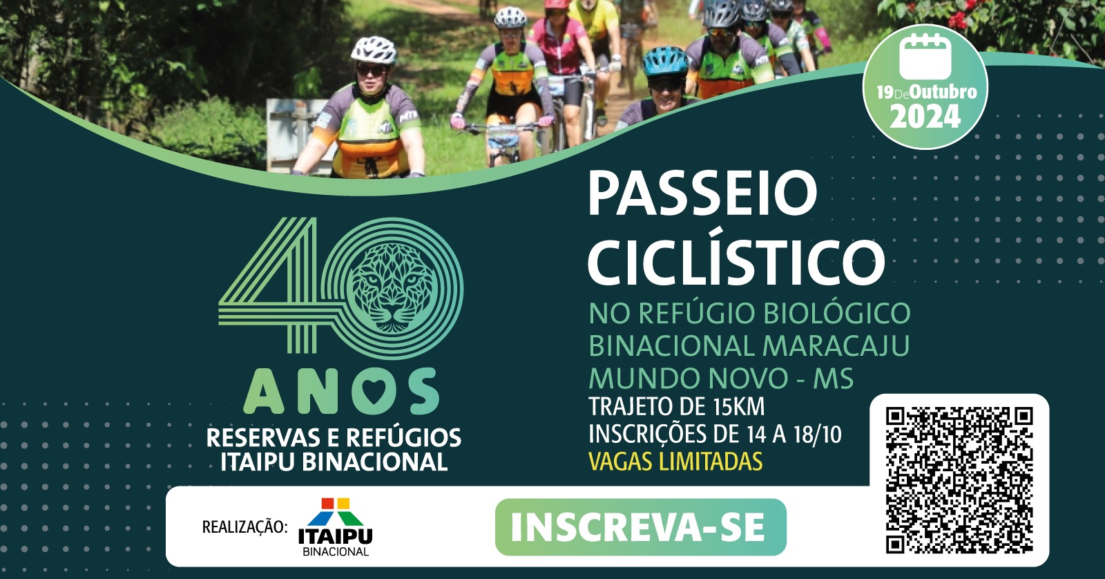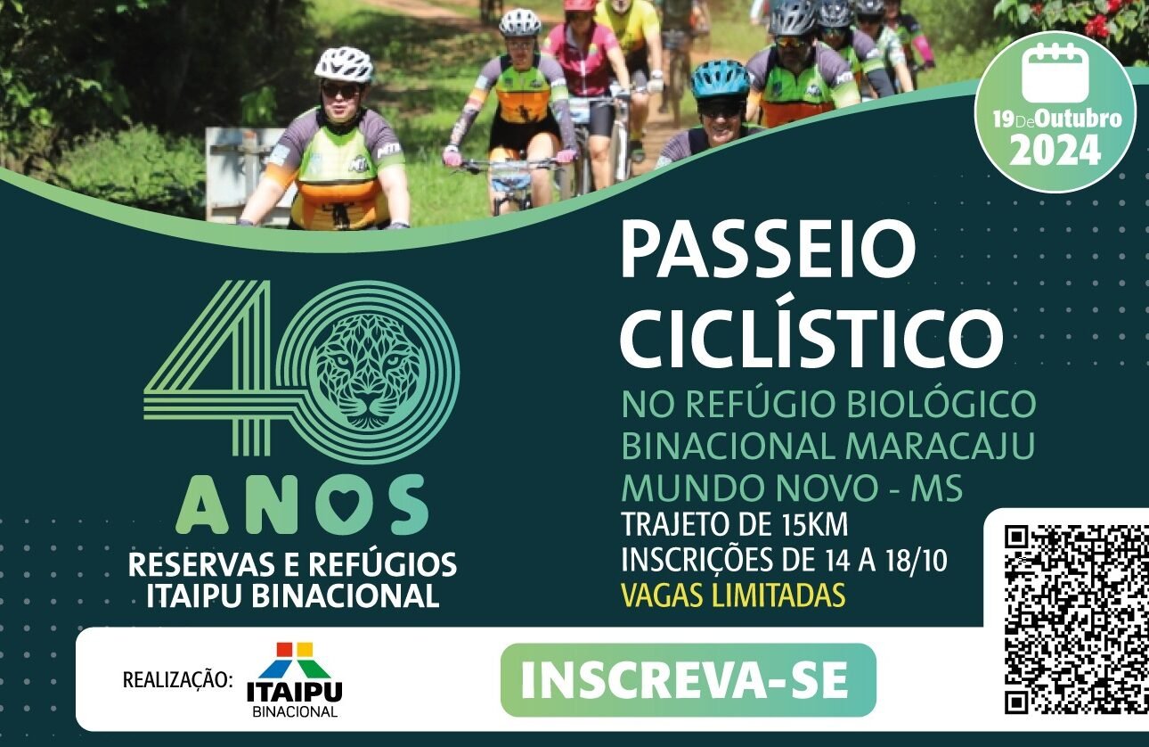 A Itaipu Binacional abre nesta segunda-feira (14) as inscrições para o Passeio Ciclístico no Refúgio Biológico Maracaju, Mundo Novo, Mato Grosso do Sul, para comemorar os 40 anos de criação das áreas protegidas. O evento será no próximo sábado (19), a partir das 9h (horário do MS).
