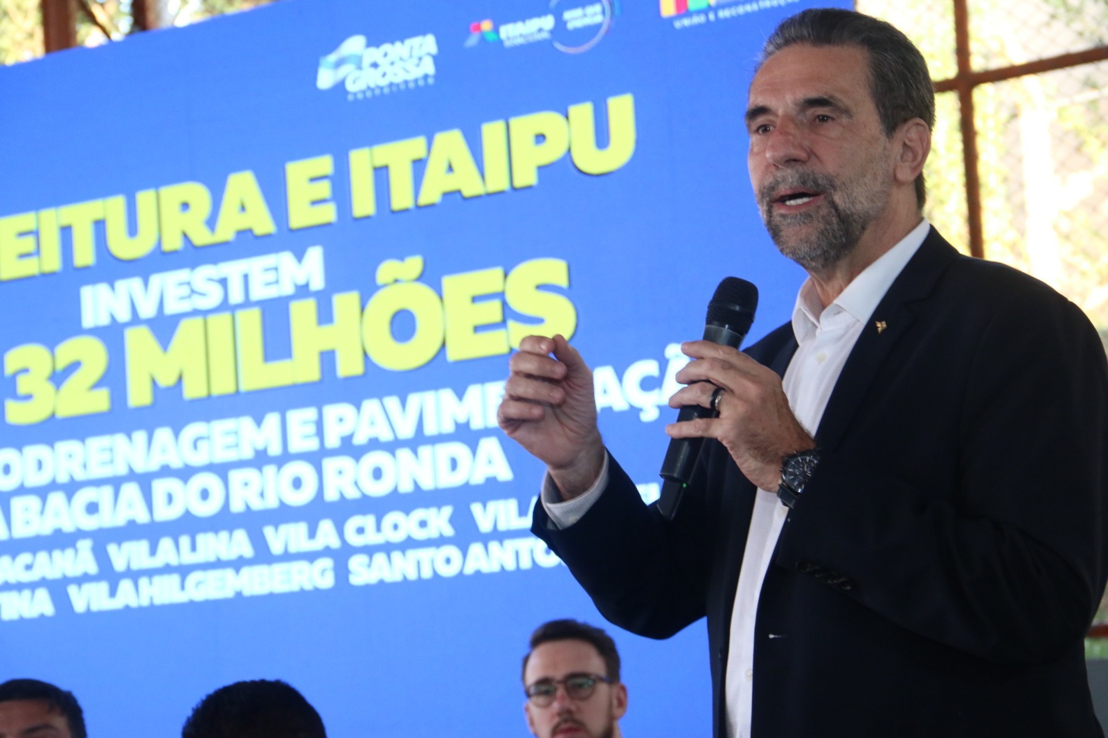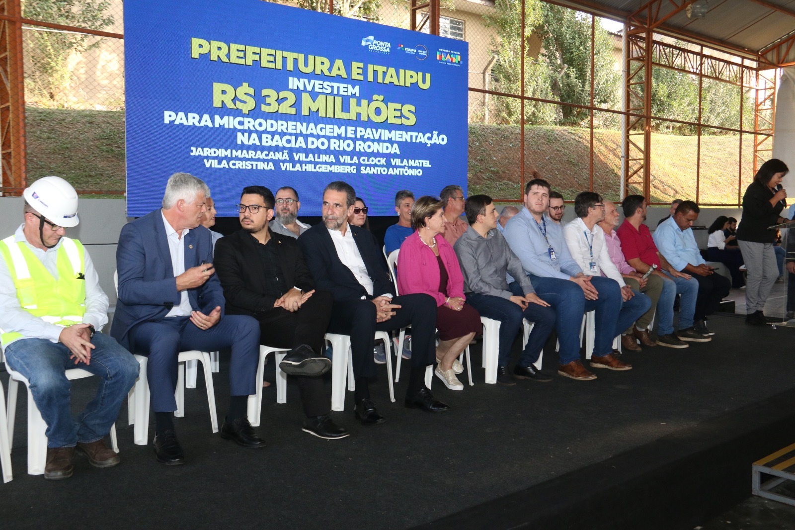O diretor-geral brasileiro de Itaipu, Enio Verri, participou de uma cerimônia nesta quinta-feira (20), na Escola Municipal Professora Haydê Ferreira de Oliveira, em Ponta Grossa (PR), para marcar o início das obras de pavimentação e microdrenagem de ruas em regiões do entorno da Bacia do Rio Ronda.