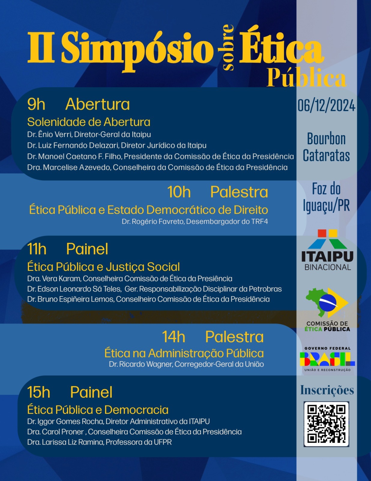 E às 15h, o painel “Ética Pública e Democracia” terá a participação do diretor administrativo da Itaipu, Iggor Gomes Rocha, da conselheira da Comissão de Ética da Presidência, Carol Proner, e da professora da UFPR, Larissa Liz Ramina.
