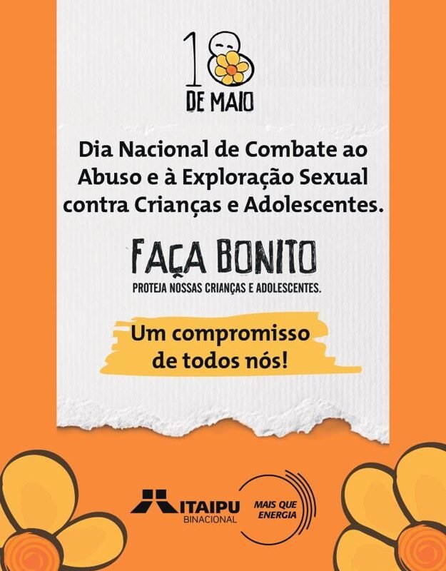 A Itaipu Binacional, por meio da Assessoria de Turismo vai se unir aos esforços da campanha “Faça Bonito: Proteja nossas crianças e adolescentes”, que no próximo dia 18 fará uma mobilização em todo o Brasil para o enfrentamento à violência sexual contra crianças e adolescentes. O dia 18 de maio foi instituído como Dia Nacional de Combate ao Abuso e à Exploração Sexual de Crianças e Adolescentes. Itaipu vai participar da mobilização com uma ação voltada para turistas e empregados(as) da usina.