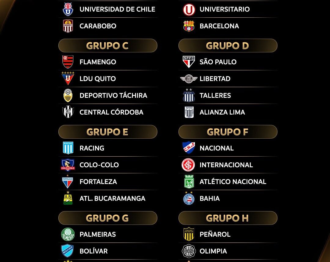 Enquanto Olimpia Faz parte do Grupo H com Peñarol de Uruguai, Vélez Sarsfield da Argentina e San Antonio De Bolivia.