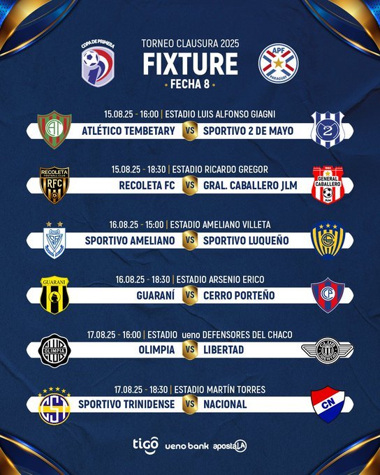 Asunción, Agencia IP.-Entre este viernes y hasta el domingo se disputará el capitulo 8 del campeonato paraguayo de fútbol de primera división.