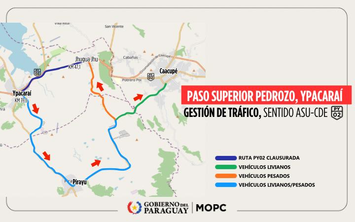 En sentido contrario, los vehículos livianos podrán circular por las rutas Caacupé–Atyrá y Cabañas–Ypacaraí, mientras que los vehículos pesados deberán hacerlo por el camino Pedrozo–Pirayú (lado norte), siguiendo hacia San Bernardino hasta reincorporarse a la PY02.