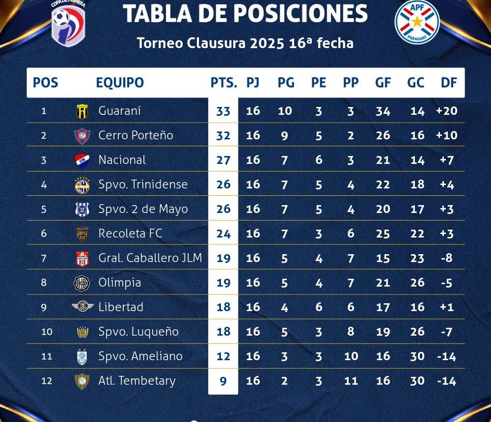 Guarani sigue liderando la clasificación con 33 puntos, Cerro Porteño es el escolta con 32 y Nacional es el tercero con 27 unidades en las principales colocaciones.