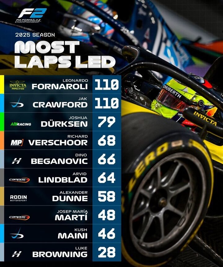 Asunción, Agencia IP.- Joshua Durksen se consolida como uno de los protagonistas de la temporada 2025 del Campeonato FIA de Fórmula 2, al acumular un total de 79 vueltas lideradas, solo superado por el campeón Leonardo Fornaroli y el vicecampeón Jak Crawford.