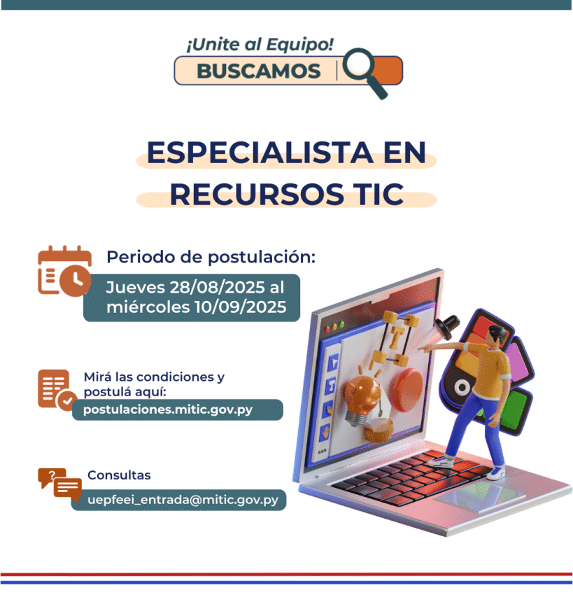Las postulaciones estarán habilitadas hasta el 10 de septiembre. Los interesados pueden acceder a más detalles a través del portal del MITIC, en la sección Oportunidades; entretanto, las aplicaciones se realizan desde el portal postulaciones.mitic.gov.py ingresando con la Identidad Electrónica.