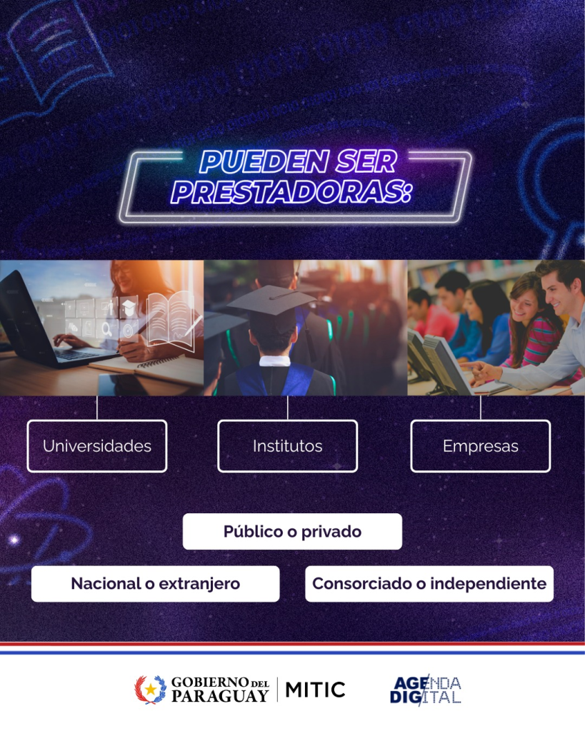 El Mitic, con el respaldo del Programa de Apoyo a la Agenda Digital, financia las capacitaciones para asegurar que los participantes accedan a formación de calidad sin costo alguno. Las instituciones interesadas en formar parte de esta red de prestadoras deben cumplir con los requisitos disponibles en www.mitic.gov.py/registroprestadora, donde también podrán acceder a toda la información necesaria para completar su inscripción.
