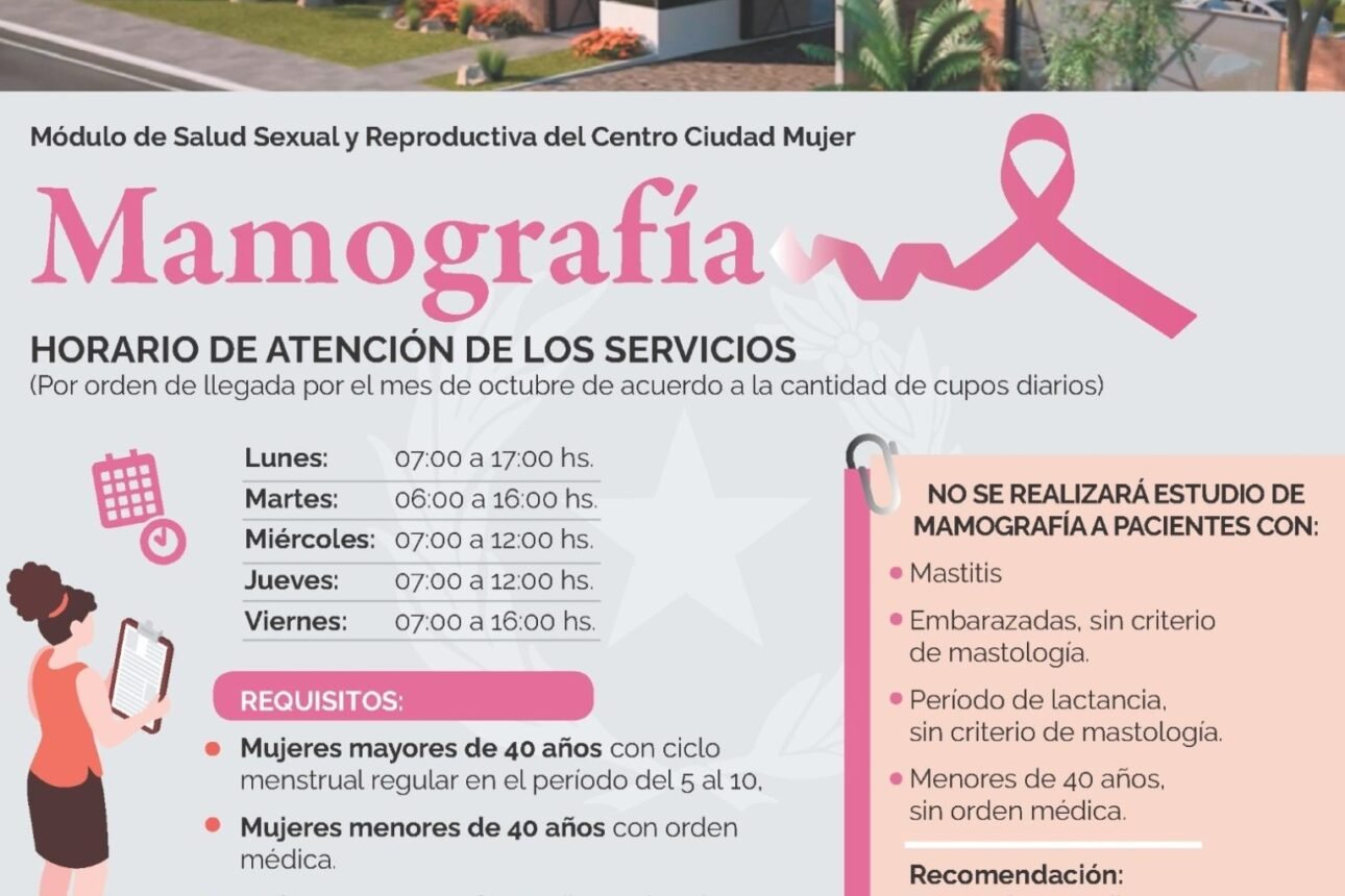 Asunción, Agencia IP.- En el contexto de Octubre Rosa, en el Centro Ciudad Mujer – Ñande Kerayvoty Renda, la atención para estudios de mamografías se realizará por orden de llegada durante este mes de octubre. El horario de atención de los servicios previsto para los días lunes será de 07:00 a 17:00; martes, de 06:00 a 16:00; miércoles y jueves, de 07:00 a 12:00 y viernes, de 07:00 a 16:00 horas.
