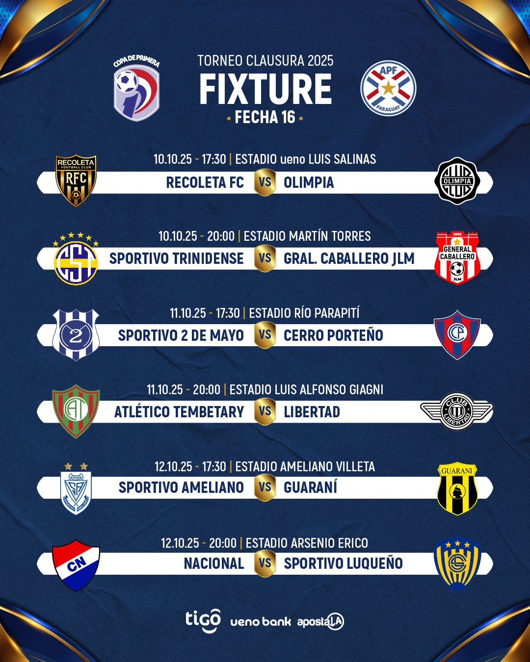Asunción, Agencia IP.-Entre este viernes y hasta el domingo se jugará íntegramente la fecha 16 del torneo clausura de la Asociación Paraguaya de fútbol.