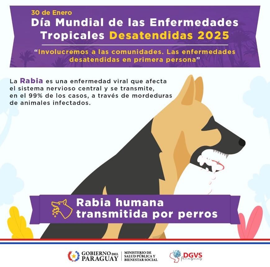 ASUNCION, AGÊNCIA IP.- A raiva é uma das zoonose mais letal e é reconhecida por quem como uma das doenças tropicais não assistidas. A vacinação é eficaz e constitui a principal ação para a prevenção da raiva em cães, bem como para impedir casos de raiva humana transmitidos por esses animais.