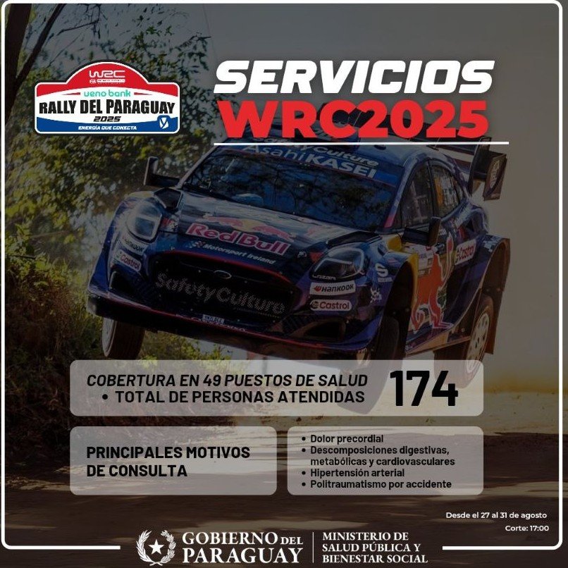 Asunción, Agencia IP.- El Ministerio de Salud Pública asistió a un total de 174 personas, con el despliegue de un equipo de más de 400 profesionales de la salud y personal de apoyo en 49 puestos fijos y provisorios, para garantizar la atención médica y sanitaria durante el Rally Mundial 2025 en Paraguay.