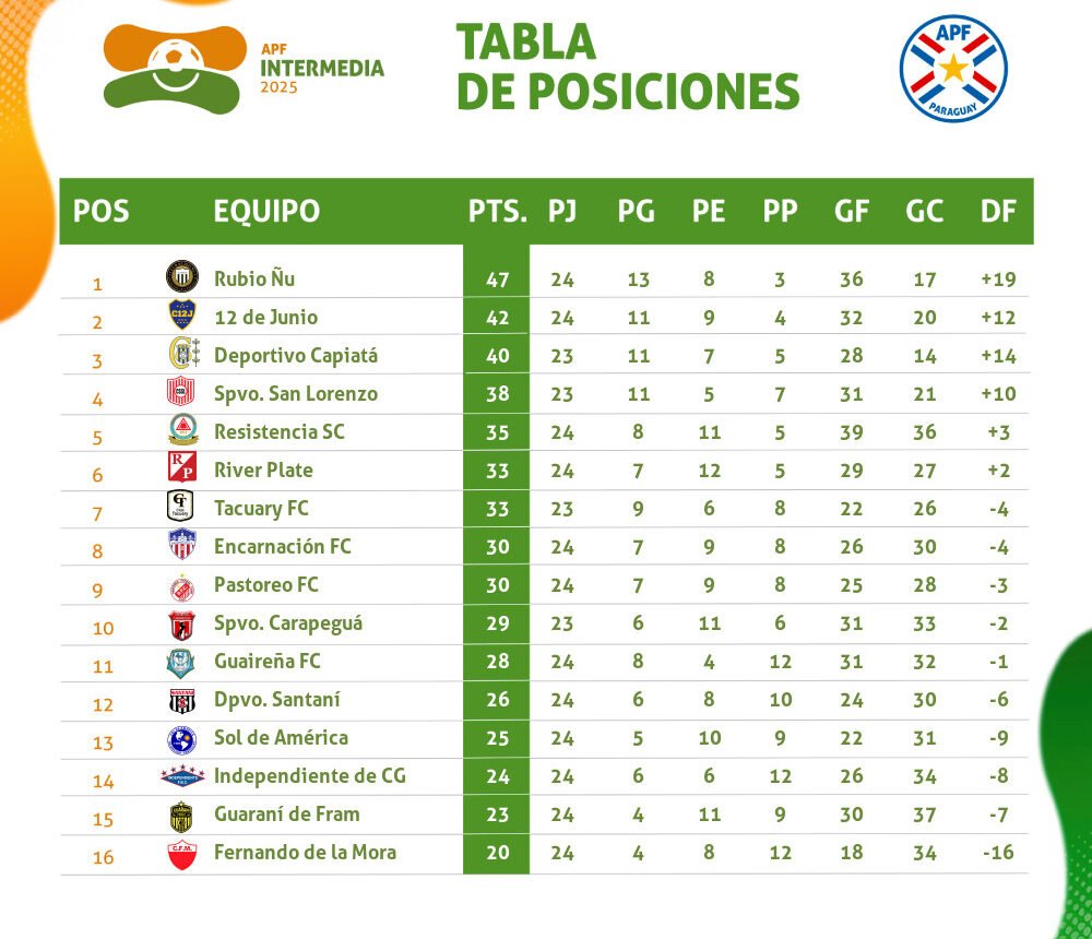 Por su parte el 12 de junio de Villa Hayes perdió sorpresivamente 2 a 1 ante Guarani de Fram y quedó con 42 unidades.