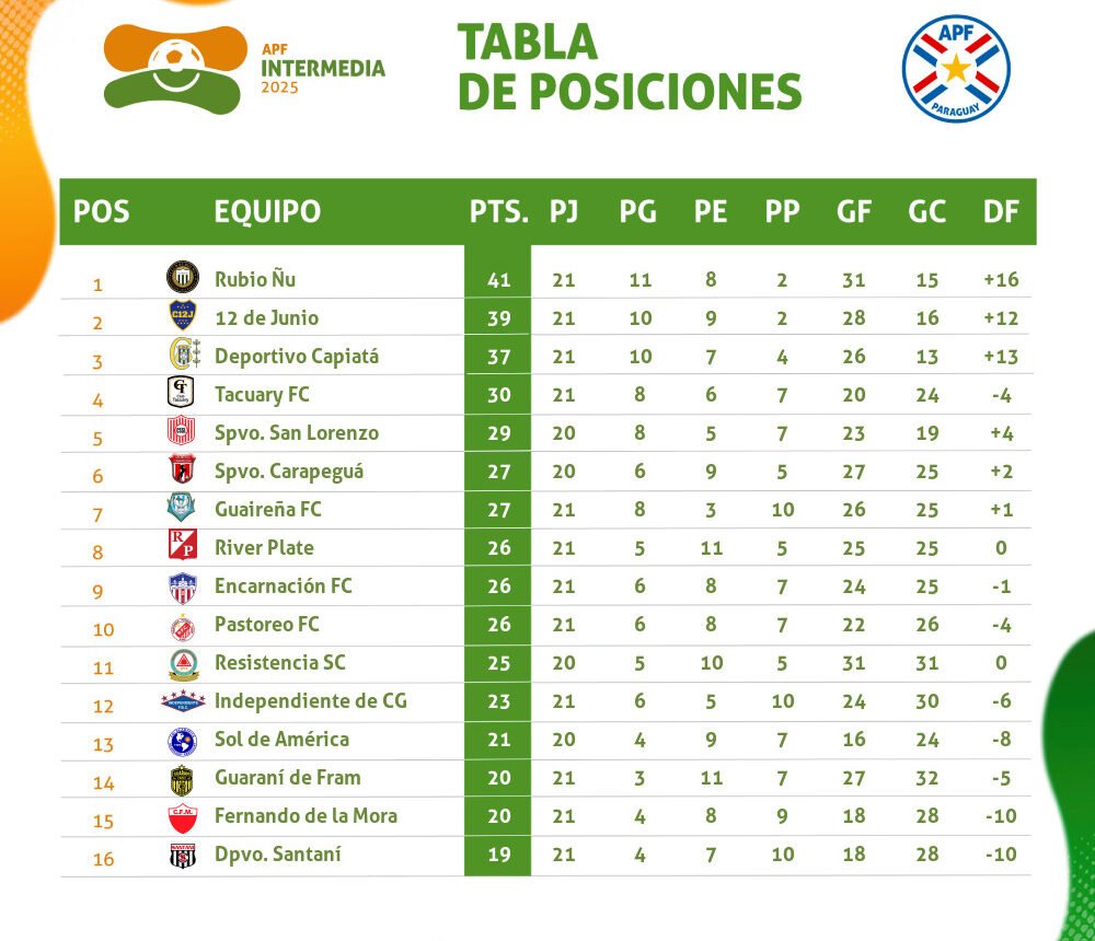 Con este resultado llegó a 41 puntos, dejando en segunda colocación al 12 de junio de Villa Hayes con 39, tras el empate de éste 1 a 1 con Pastoreo.