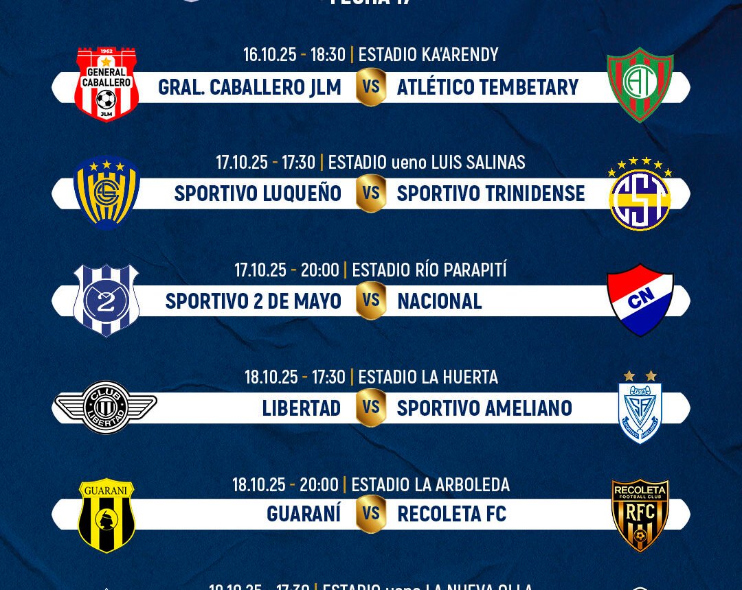 Asunción, Agencia IP.-Entre este jueves y hasta el domingo, se jugaran los partidos correspondientes a la fecha numero 17 del torneo clausura de la Asociación Paraguaya de fútbol.