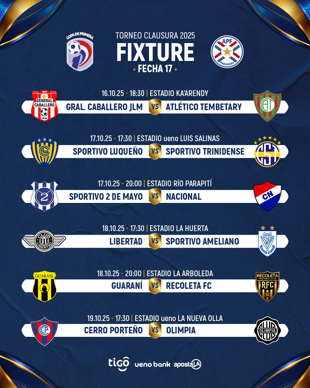 Asunción, Agencia IP.-Entre este jueves y hasta el domingo, se jugaran los partidos correspondientes a la fecha numero 17 del torneo clausura de la Asociación Paraguaya de fútbol.