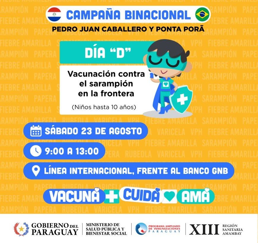 Asunción, Agencia IP.- En la Línea Internacional que une a Paraguay y Brasil, se llevará a cabo el «Día D» de la Vacunación Binacional contra el sarampión, este sábado 23 de agosto. Esta dirigida a niños de hasta 10 años. Se hará a través del trabajo coordinado de los Ministerios de Salud de Paraguay y Brasil, con el acompañamiento de autoridades sanitarias locales.